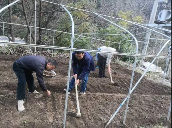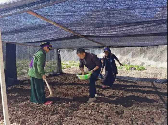 在大石凼村的種植試驗(yàn)大棚里,我和石高讓木初、俄瑪頭等村民一起勞作